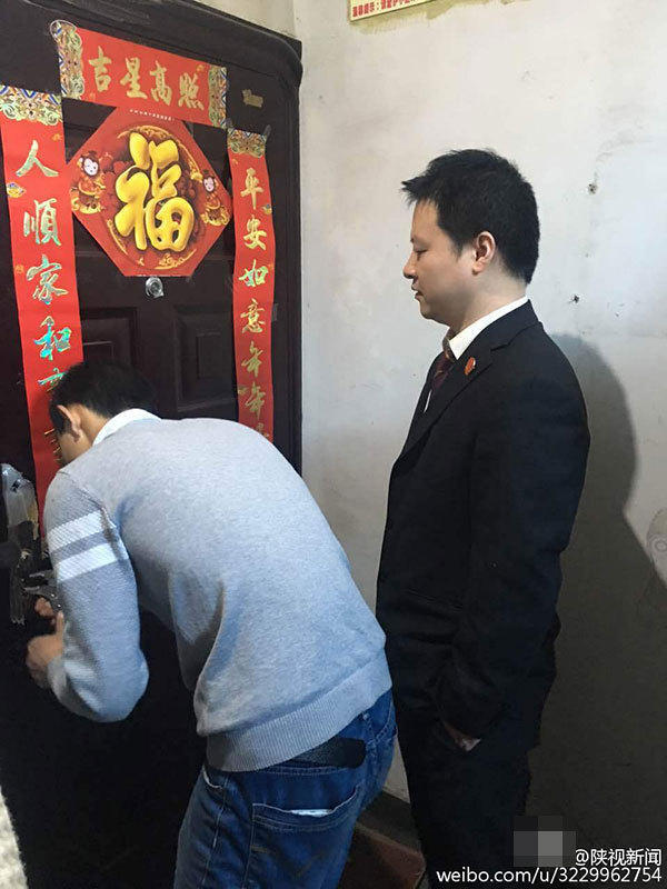 4/7执行期间,星龙公司员工向西安中院提起第三人撤销之诉,请求撤销本案执行依据的判决书。在诉讼期间,雁塔区法院没有强制执行。在第三人撤销之诉被上级法院驳回后,雁塔法院又多次上门向被执行人及其公司员工谈话做工作,责令其主动履行生效判决,但星龙公司及其员工仍拒不履行。图为执法人员强行开锁。